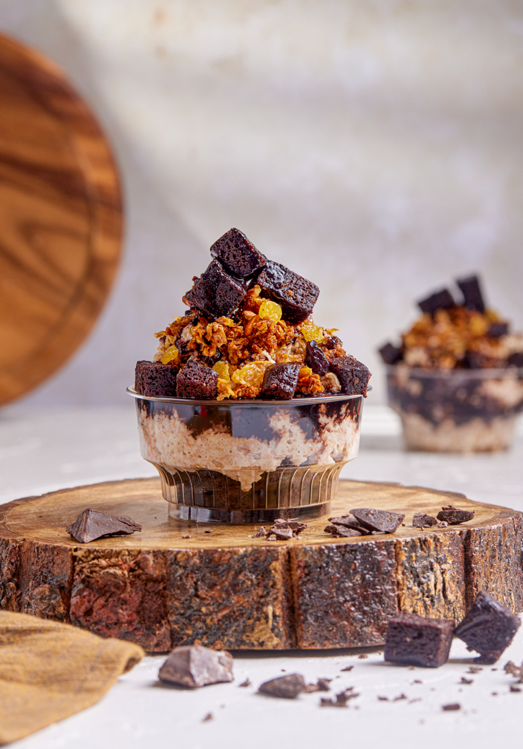 Warm fudge brownie topped with vanilla ice cream, chocolate drizzle and a shot of hot espresso.